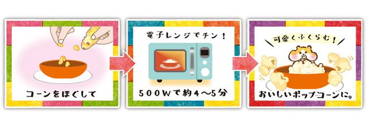 ・ほぐしたコーンを耐熱容器に入れてラップをかけ、500Wの(※1)電子レンジで約4~5分加熱すると、ポップコーンとして与えられます。(※2)