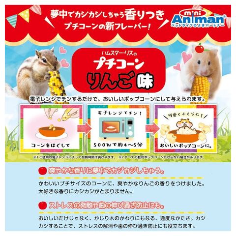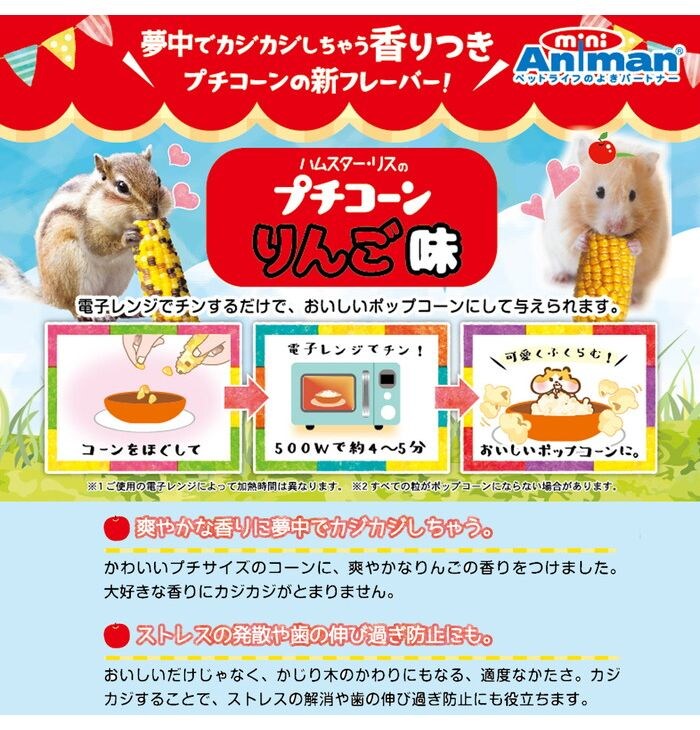 ・ハムスターやリスが食べやすいプチサイズのトウモロコシに、夢中でかじる爽やかなりんごの香りをつけました。