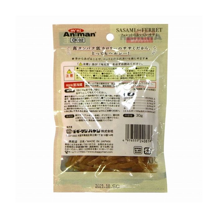 ・フェレットの必須アミノ酸のアルギニンを含み、鶏肉の中で最も低脂肪な部位であるササミを使い、食べやすくやわらかい細切りカットに仕上げました。