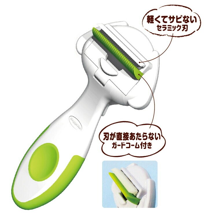 換毛期の抜け毛をからめ取りながらブラッシングができるウサギ専用のブラシ。刃には軽くてサビないセラミックを使用し、刃が直接皮膚に当たらないガードコーム付き。抜け毛が多い換毛期にはガードコームを収納して使用可能。