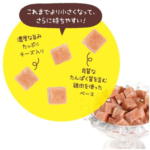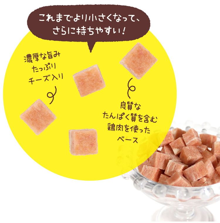 小麦粉、肉類(鶏ササミ、鶏肉)、糖類、ゼラチン、チーズ、グリセリン、プロピレングリコール、着色料(酸化チタン、黄4、赤106)、ソルビトール、保存料(ソルビン酸カリウム)、ミネラル類(ナトリウム)、pH調整剤、膨張剤、酸化防止剤(ビタミンE)、香料