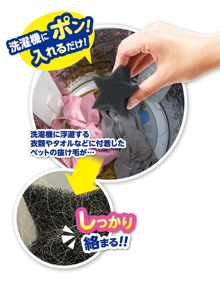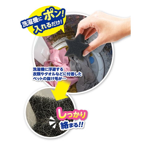 スポンジの目が細かく均一なので、洗濯槽内に浮遊するペットの細かい毛や糸くずをキャッチして離しません。星型で衣類に接する面が多いのも特徴です。