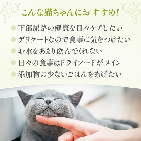 厳選した原材料とこだわりの製法で高い嗜好性を持つ成猫用総合栄養食。ミネラル成分を調整し、尿石の形成に配慮。動物性たんぱく質は天然まぐろのみを使用、グルテンフリーでグルテン等にアレルギーのある子に配慮しています。自然の栄養価を保つためスチーム製法を採用。食品の鮮度を維持するために、全ての原材料は調理開始から2時間以内に製品化されます。着色料、保存料不使用。