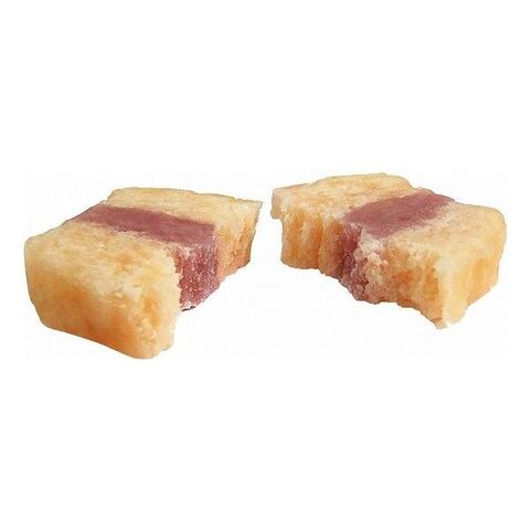 小麦粉、鶏ささみ、ショートニング、ブルーベリーフィリング、ソルビトール、プロピレングリコール、膨張剤、保存料(ソルビン酸K)、食塩、pH調整剤、着色料(クチナシ、赤2、赤106、青1、青2)、酸化防止剤(エリソルビン酸Na)、香料