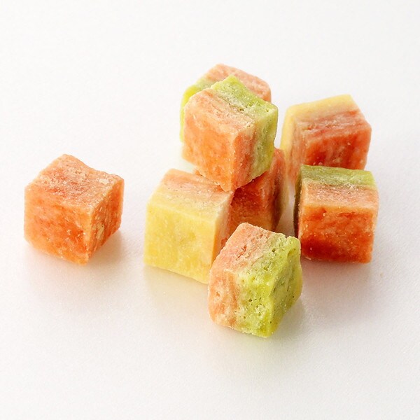 小麦粉、鶏肉、鶏ささみ、チーズ、牛肉、でん粉類、ほうれん草、ソルビトール、グリセリン、膨張剤、着色料(赤106、黄4、黄5、青1、酸化チタン)、保存料(ソルビン酸K)、pH調整剤、食塩、酸化防止剤(エリソルビン酸Na)、香料