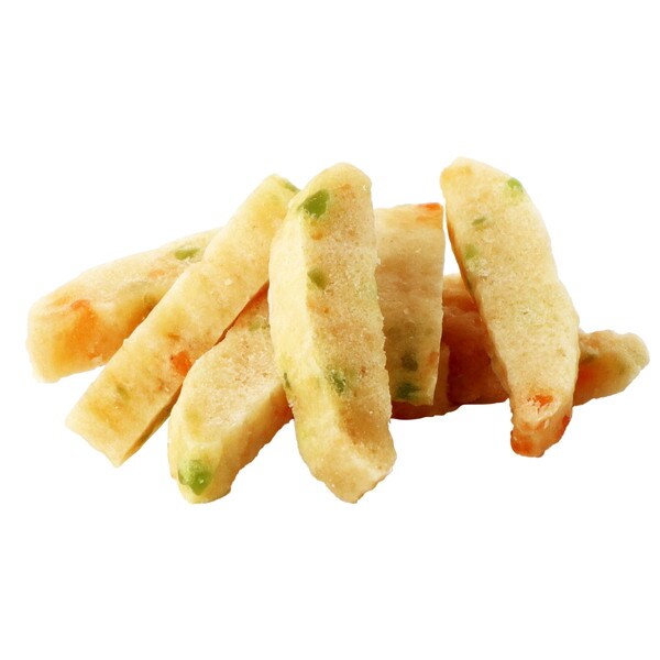 ぜいたくに国産野菜を使いました。ささみとおじゃがを練り込んだ生地にほうれん草・にんじんをトッピングしました。やわらかい仕上がりで、小型・シニア犬にもオススメ。