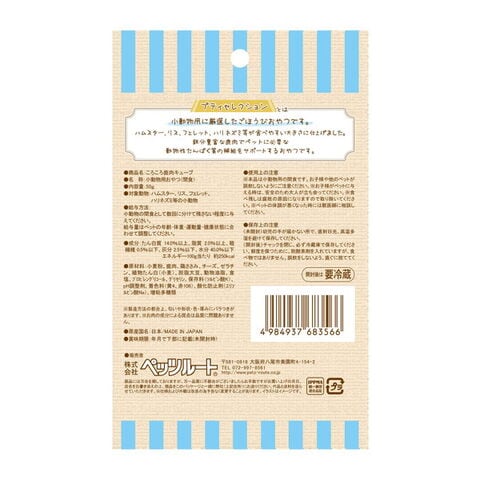 ハムスター、リス、フェレット、ハリネズミ等が食べやすい大きさに仕上げました。鉄分豊富な鹿肉でペットに必要な動物性たんぱく質の補給をサポートするおやつです。