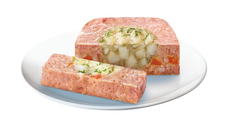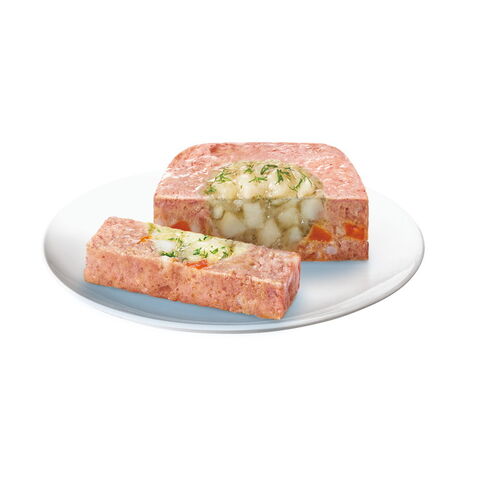 肉類(チキン、家禽等)、ポテト、サーモン、野菜類(にんじん)、玄米、ディル、チコリー繊維、ビートパルプ、ビタミン類、ミネラル類、増粘多糖類、リン酸塩(Na)