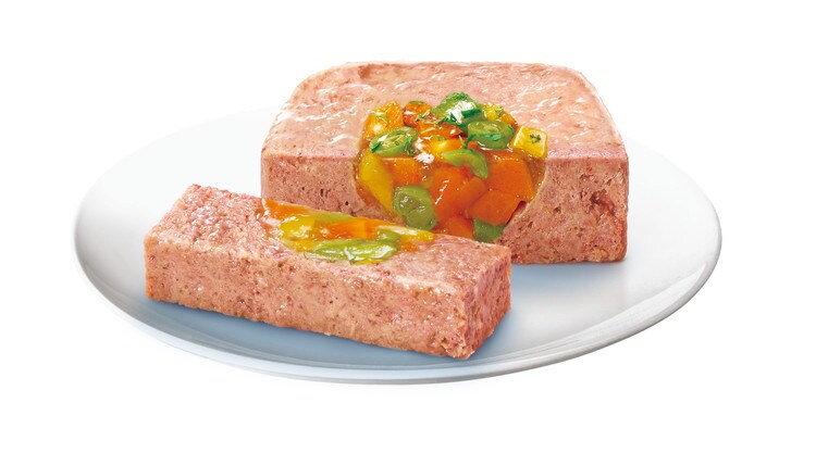 肉類(チキン、家禽等)、魚類(サーモン、白身魚、まぐろエキス等)、野菜類(にんじん、いんげん、パプリカ)、チコリー繊維、ビートパルプ、ディル、ビタミン類、ミネラル類、増粘多糖類、リン酸塩(Na)、着色料(二酸化チタン)、EDTA-Ca・Na
