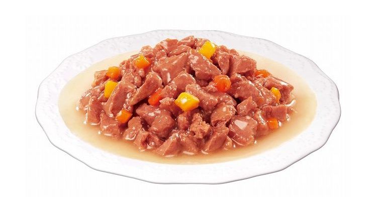 肉類(チキン、鶏レバー、ビーフ等)、野菜類(にんじん、かぼちゃ)、チーズパウダー、増粘安定剤(加工でん粉、増粘多糖類)、調味料、リン酸塩、塩化カリウム、食塩、発色剤(亜硝酸Na)