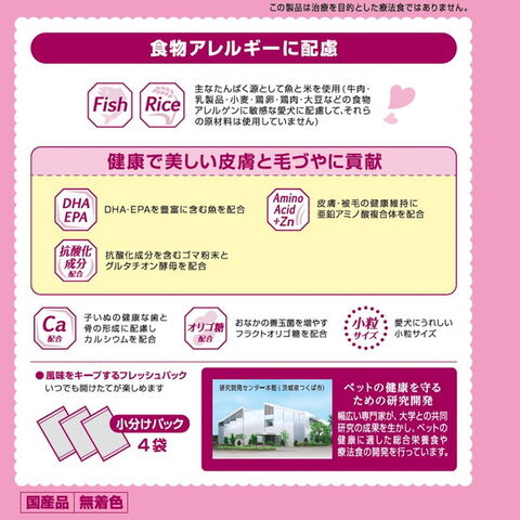 穀類(米粉、米、米ぬか)、魚介類(フィッシュミール:DHA・EPA源 、サーモンミール、フィッシュエキス)、油脂類(動物性油脂、ライスファットカルシウム、アマニ油)、種実類(ゴマ粉末)、糖類(フラクトオリゴ糖)、グルタチオン酵母、シャンピニオンエキス、ビタミン類(A、E、K3、B1、B2、パントテン酸、ナイアシン、B6、葉酸、ビオチン、B12、C、コリン)、ミネラル類(カルシウム、リン、ナトリウム、カリウム、塩素、鉄、コバルト、銅、マンガン、亜鉛アミノ酸複合体、亜鉛、ヨウ素)、アミノ酸類(L-トレオニン)、酸化防止剤(ローズマリー抽出物、ミックストコフェロール)