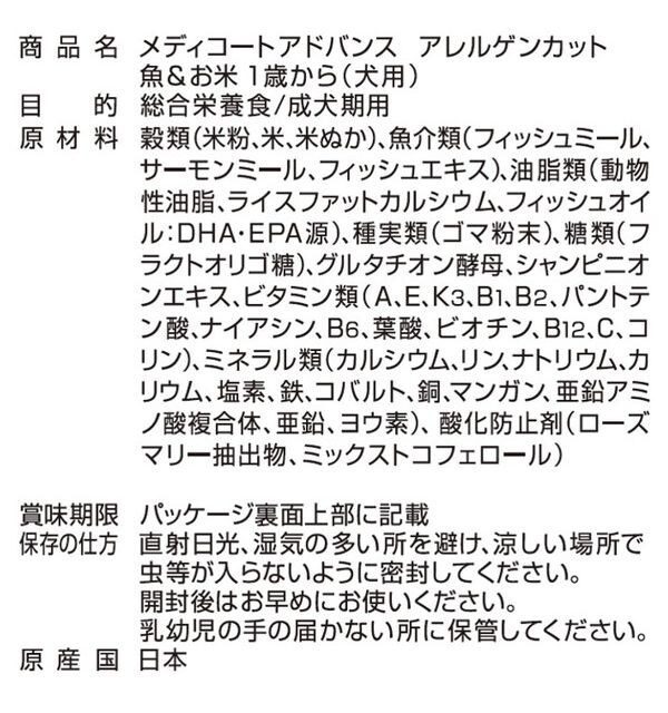 穀類(米粉、米、米ぬか)、魚介類(フィッシュミール、サーモンミール、フィッシュエキス)、油脂類(動物性油脂、ライスファットカルシウム、フィッシュオイル:DHA・EPA源)、種実類(ゴマ粉末)、糖類(フラクトオリゴ糖)、グルタチオン酵母、シャンピニオンエキス、ビタミン類(A、E、K3、B1、B2、パントテン酸、ナイアシン、B6、葉酸、ビオチン、B12、C、コリン)、ミネラル類(カルシウム、リン、ナトリウム、カリウム、塩素、鉄、コバルト、銅、マンガン、亜鉛アミノ酸複合体、亜鉛、ヨウ素)、酸化防止剤(ローズマリー抽出物、ミックストコフェロール)