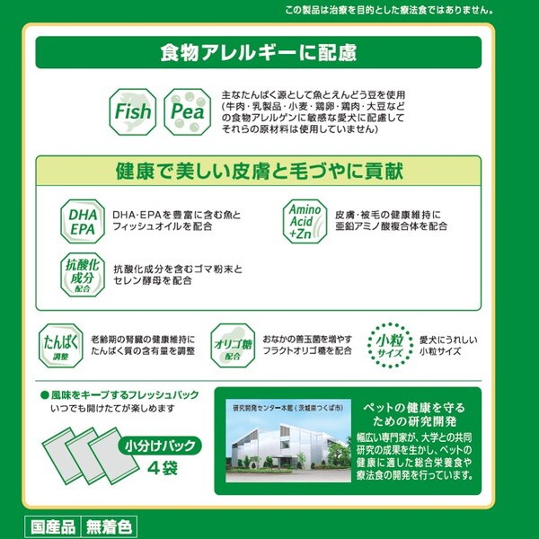 豆類(えんどう豆たんぱく、えんどう豆繊維)、でん粉類(コーンスターチ)、油脂類(動物性油脂、フィッシュオイル:DHA・EPA源、ライスファットカルシウム)、魚介類(フィッシュミール、フィッシュエキス)、種実類(ゴマ粉末)、糖類(フラクトオリゴ糖)、セレン酵母、ビタミン類(A、E、K3、B1、B2、パントテン酸、ナイアシン、B6、葉酸、ビオチン、B12、C、コリン)、ミネラル類(カルシウム、リン、ナトリウム、カリウム、塩素、鉄、コバルト、銅、マンガン、亜鉛アミノ酸複合体、亜鉛、ヨウ素)、アミノ酸類(メチオニン)、酸化防止剤(ローズマリー抽出物、ミックストコフェロール)
