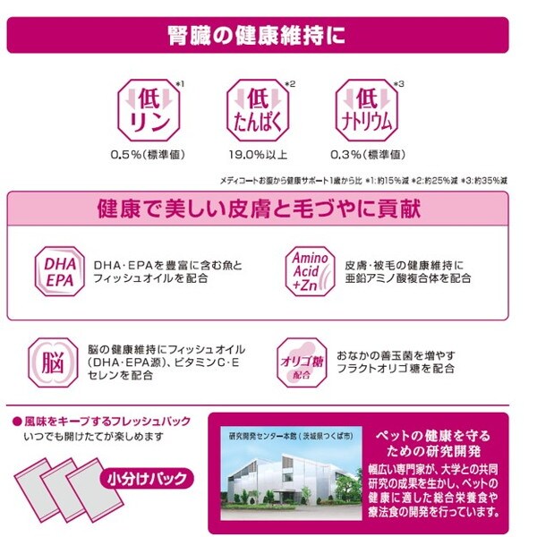 ・腎臓の健康維持に配慮して、たんぱく質およびリンとナトリウムの含有量を調整。
