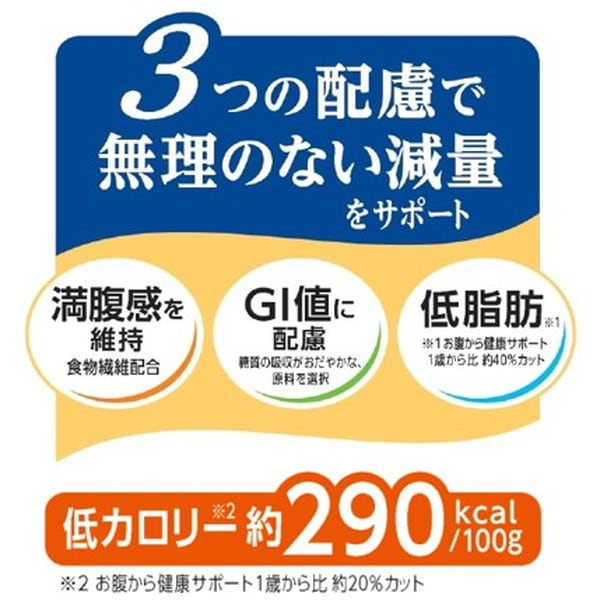 ・低カロリーに加え、「満腹感を維持」「GI値に配慮」「低脂肪」の3つの配慮で健康な体重管理をサポートします。