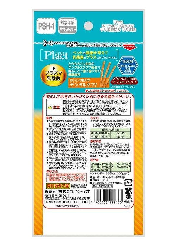 Plactはペットの健康を考えて乳酸菌をプラスしたブランドです。美味しく食べやすいササミの細切りにとうもろこし由来のデンタルスクラブを配合。毎日美味しく歯みがきができる!着色料・保存料・香料無添加。
