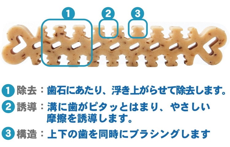 愛犬が食べるだけで歯をスムーズに溝へ誘導。口腔構造を考えた、上下の歯がかみあう設計。独特な形状が摩擦力を高め、歯みがき効果を発揮します。