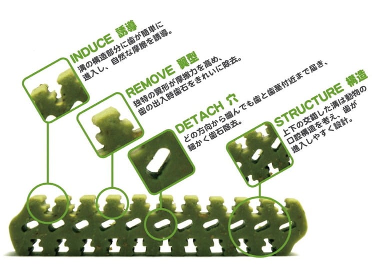 愛犬が食べるだけで歯をスムーズに溝へ誘導。口腔構造を考えた、上下の歯がかみあう設計。独特な形状が摩擦力を高め、歯みがき効果を発揮します。