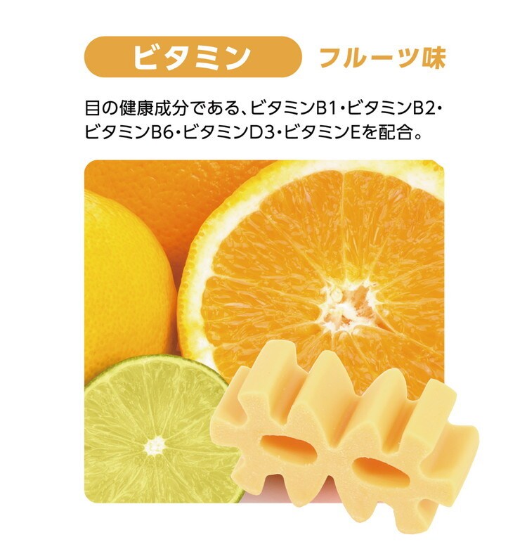 ライスパウダー、コンスターチ、マルチトール、イソマルトオリゴ糖、グリセリン、ゼラチン、グリセリン脂肪酸エステル、ビタミンMIX(B1・B2・B6・D3・E)、ミックスフルーツ香料、パプリカ色素