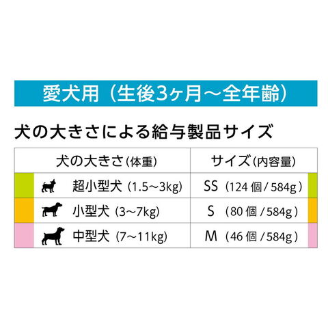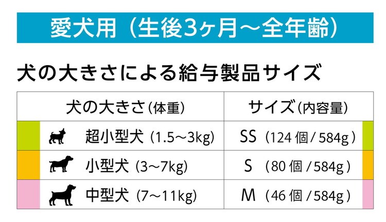 ・体重に合ったサイズを選び、朝、夜1本ずつお与えください。与えすぎは消化負担になりますので1日の給与量をお守りください。