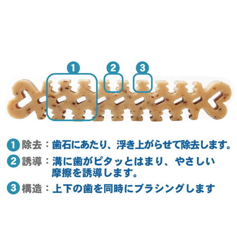・こびりついた歯垢部分を重点的に除去したい時は、その部分を噛ませ、飼主は遊ぶようにして手で引っ張ったり、押し合うように続けると、より簡単に除去しやすくなります。しかし、これを行う際は、愛犬との信頼関係ができている場合にのみ留意しご使用ください。