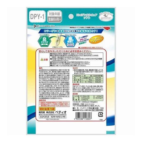 お口の中を爽快に(エリスリトール・りんごポリフェノール)、息リフレッシュ(クロロフィル・ミント)、歯の健康に(カルシウム・ビタミンD)の3つの機能でワンちゃんのエチケットに。ほんのりミルク風味。