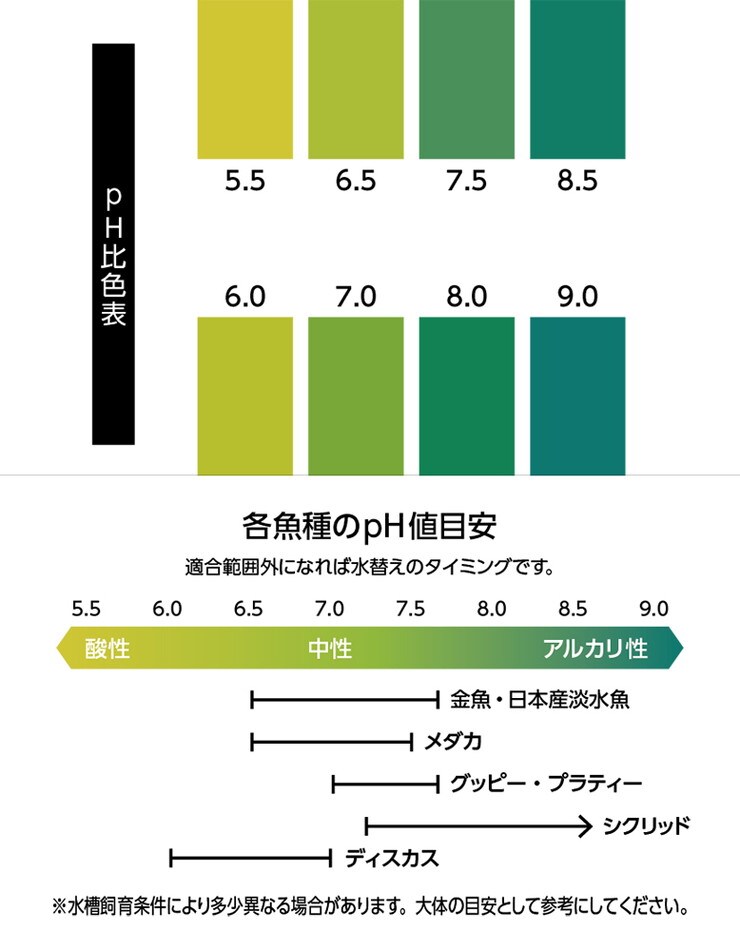 本製品は、飼育水(淡水)の状況をpHで測定し水換えのタイミングを計るpHチェックシートです。魚の種類によって適正値が異なります。金魚やアフリカンシクリッド等は、アルカリ性を好み多くの小型熱帯魚は弱酸性を好みます。本製品を使用して水換え時期の目安にしてください。