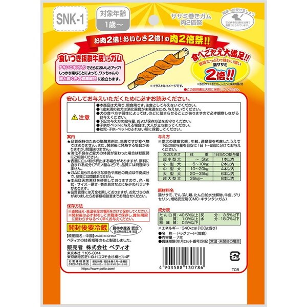 食べごたえ大満足!旨味たっぷりで味わい深い鶏ササミを2倍巻きました!(メーカー比)鶏ササミとガムの美味しさが味わえるスナックです。保存料・着色料不使用。