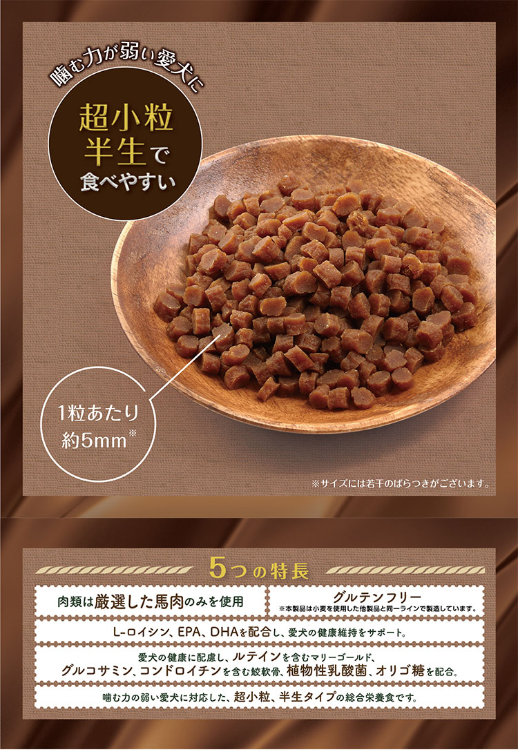 顎の力の弱い愛犬に対応した、セミモイストタイプの犬用総合栄養食。グルテンアレルギーの愛犬に配慮して、グルテンを使用していません。低アレルゲンの馬肉を40%以上配合で抜群のおいしさです。半生で超小粒なので噛む力の衰えた超高齢犬にも対応しています。愛犬の健康に配慮し、健康な筋肉を維持するL-ロイシン、DHA・EPA、目の健康に配慮しルテインを含むマリーゴールド、関節の健康をサポートするグルコサミン、コンドロイチンを含む鮫軟骨、お腹の健康をサポートする植物性乳酸菌、オリゴ糖を配合しています。成犬~超高齢犬用。