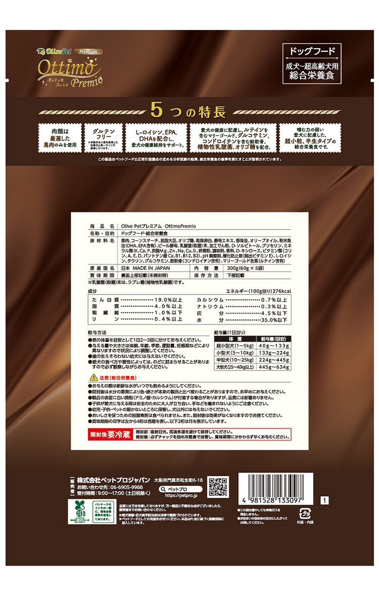 馬肉、コーンスターチ、脱脂大豆、オリゴ糖、乾燥卵白、酵母エキス、香味油、オリーブオイル、粉末魚油(DHA、EPA含有)、ビール酵母、乳酸菌(殺菌)末、加工でん粉、D-ソルビトール、グリセリン、ミネラル類(K、Ca、P、炭酸Mg、Zn、Na、Cu、I)、卵黄粉、調味料、香料、D-キシロース、ビタミン類(コリン、A、E、D、パントテン酸Ca、B1、B12、B2)、pH調整剤、酸化防止剤(抽出ビタミンE)、L-ロイシン、タウリン、グルコサミン、鮫軟骨(コンドロイチン含有)、マリーゴールド色素(ルテイン含有)
