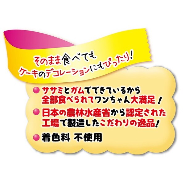 ササミとガムでできているから全部食べられてワンちゃん大満足!そのまま食べてもケーキのデコレーションにもぴったり!かわいい5種類の形入り。着色料不使用。