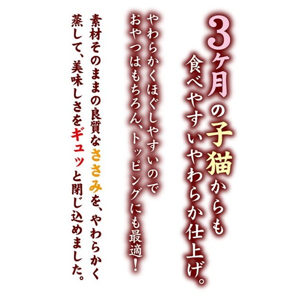 ほたての旨味だしたっぷり。素材そのままの良質なささみを、やわらかく蒸して、美味しさをギュッと閉じ込めました。やわらかくほぐしやすいので、おやつはもちろん、トッピングにも最適!猫ちゃんの健康維持にタウリン配合。2つに分けて保存できる。着色料 不使用。