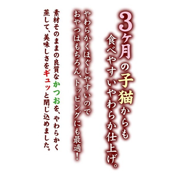 かつお節の旨味だしたっぷり。素材そのままの良質なかつおを、やわらかく蒸して、美味しさをギュッと閉じ込めました。やわらかくほぐしやすいので、おやつはもちろん、トッピングにも最適!猫ちゃんの健康維持にタウリン配合。2つに分けて保存できる。着色料 不使用。