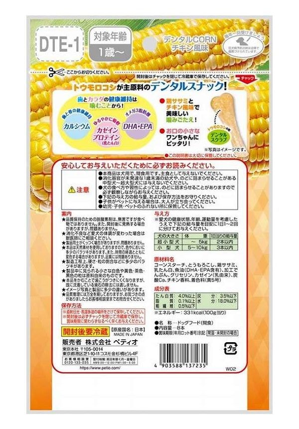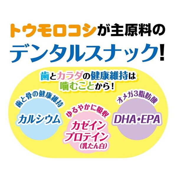 歯とカラダの健康維持は噛むことから!鶏ササミ入りの美味しいチキン風味デンタルスナック!歯と骨の健康を維持するカルシウム、トウモロコシでできたデンタルスクラブ、ゆるやかに吸収できるカゼインプロテイン配合。お口の小さなワンちゃんにピッタリ!