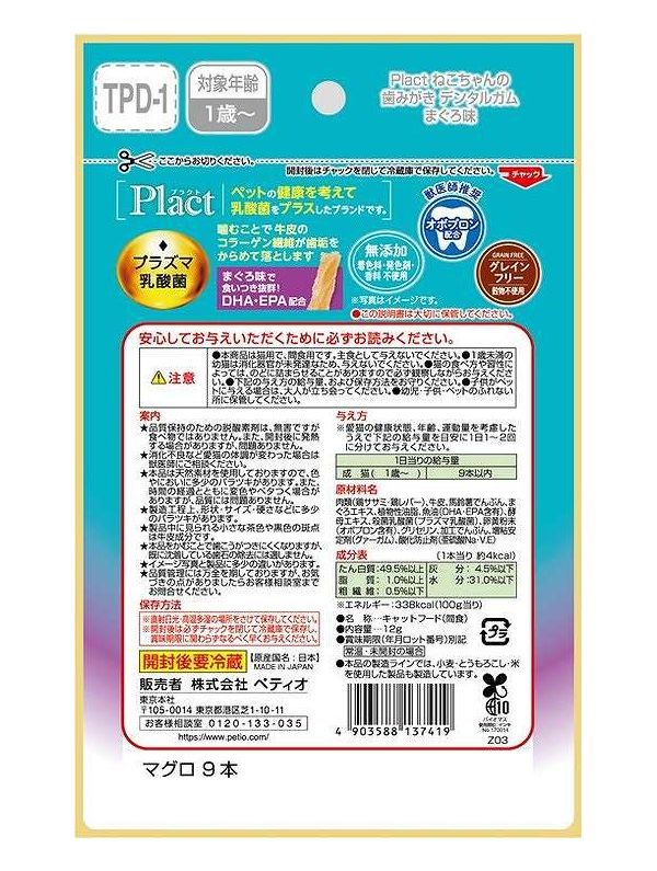 【10個セット】 ペティオ プラクト ねこちゃんの 歯みがきデンタルガム まぐろ味 12g【ポイント10倍】 【送料無料】