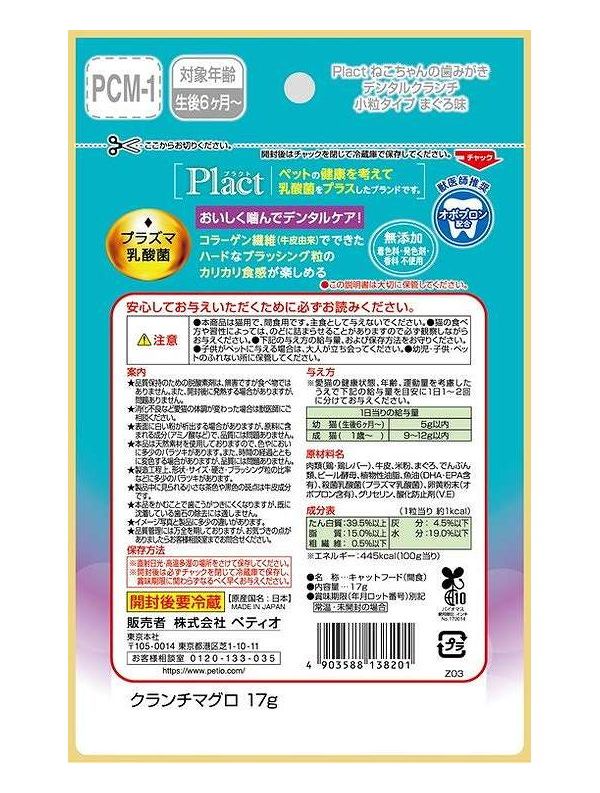 【10個セット】 ペティオ プラクト ねこちゃんの 歯みがき デンタルクランチ 小粒タイプ まぐろ味 17g【ポイント10倍】 【送料無料】