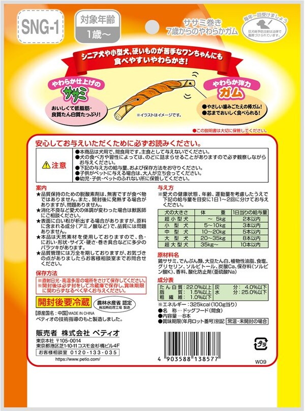 シニア犬にも食べやすいやわらかさ!やわらか仕上げのササミをやさしい噛みごたえのやわらか弾力ガムに巻いているから、芯までおいしく食べられる!小型犬や硬いものが苦手なワンちゃんにも食べやすい。着色料不使用。