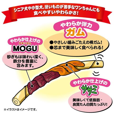 低脂肪・良質たん白質豊富なササミと鉄分豊富で味わい深い砂ぎもをやわらかく仕上げて、芯までおいしく食べられるやわらか弾力ガムに巻きました。シニア犬や小型犬、硬いものが苦手なワンちゃんにもオススメ!着色料不使用。