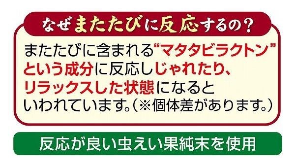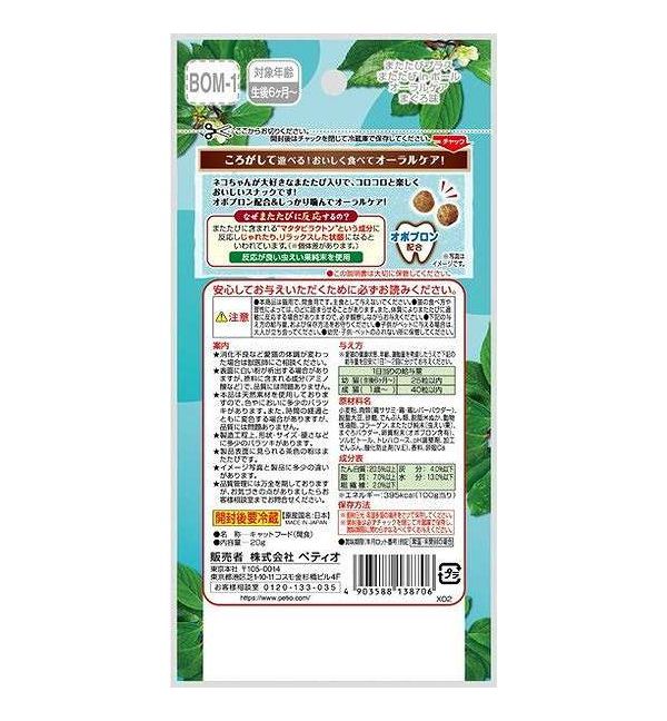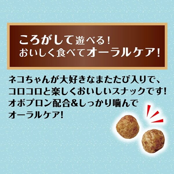カリッと焼き上げたまん丸粒にまたたびをコーティング!またたびの中でも反応が良い虫えい果の純末を使用。オボプロン配合&おいしく噛んでオーラルケア!着色料不使用。
