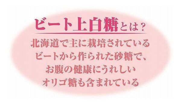(ビート上白糖とは:北海道で主に栽培されているビートから作られた砂糖で、お腹の健康にうれしいオリゴ糖も含まれています。)