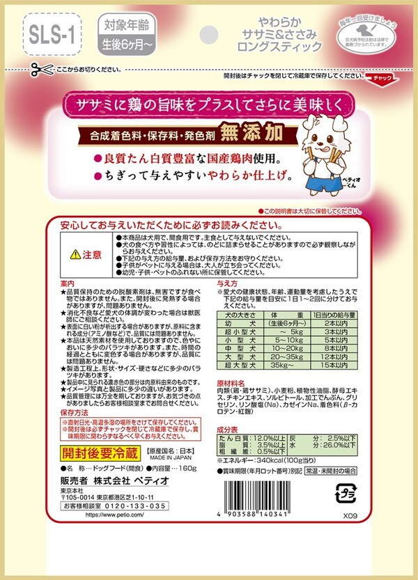 肉類(鶏・鶏ササミ)、小麦粉、植物性油脂、酵母エキス、チキンエキス、ソルビトール、加工でんぷん、グリセリン、リン酸塩(Na)、カゼインNa、着色料(βーカロテン・紅麹)