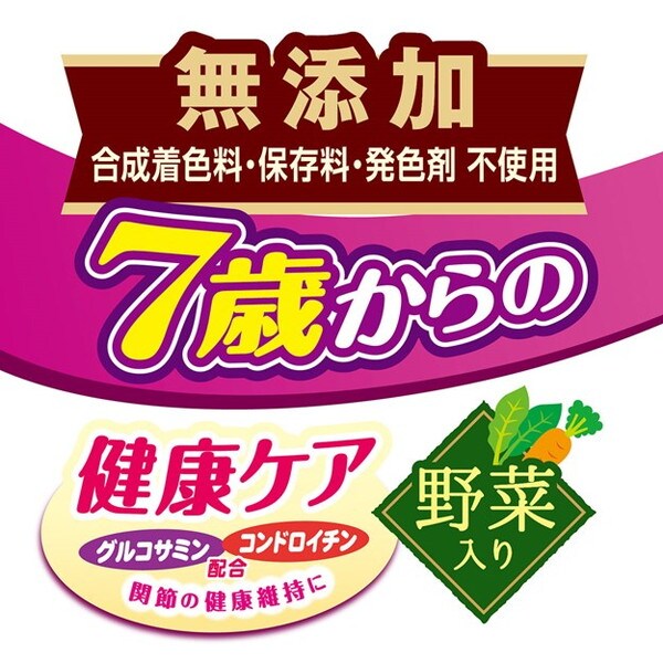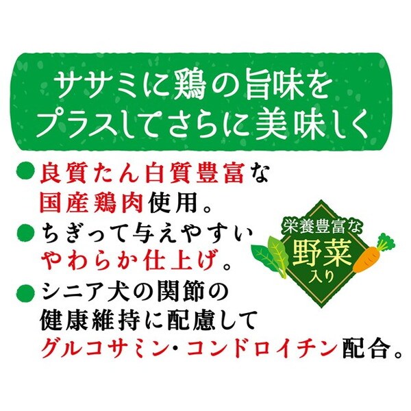 シニア期になると気になる関節の健康維持に役立つグルコサミンとコンドロイチン配合。風味豊かな鶏肉と良質たん白質が豊富な鶏ササミをたっぷり使用しました。ちぎって与えやすく、シニア犬や小型犬にも食べやすいやわらかさに仕上げました。栄養豊富なほうれん草、にんじん入り。