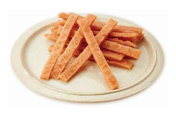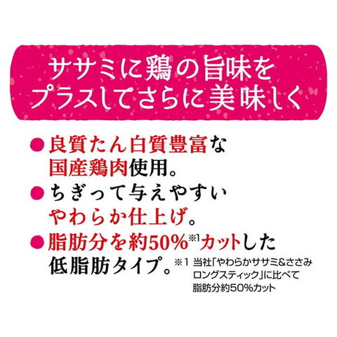 低脂肪・良質たん白質が豊富な鶏ササミを使用。脂肪分を約50%カットした低脂肪タイプ(当社「やわらかササミ&ささみ ロングスティックタイプ」比)だから、肥満が気になるワンちゃんにぴったり。コラーゲン配合で皮膚や被毛、関節の健康を保つ。ちぎってあたえやすい。