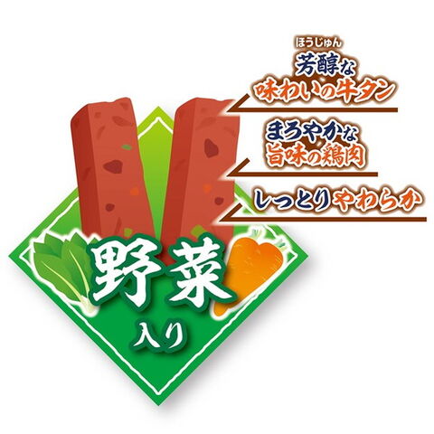 肉類(鶏・鶏レバー・牛タン)、パン粉、小麦粉、でんぷん類、食塩、地鶏エキス、にんじん、ほうれん草、加工でんぷん、グリセリン、プロピレングリコール、リン酸塩(Na)、保存料(ソルビン酸K)、酸化防止剤(エリソルビン酸Na)、炭酸Ca、カゼインNa、発色剤(亜硝酸Na)、着色料(β-カロテン・赤106号・銅葉緑素)