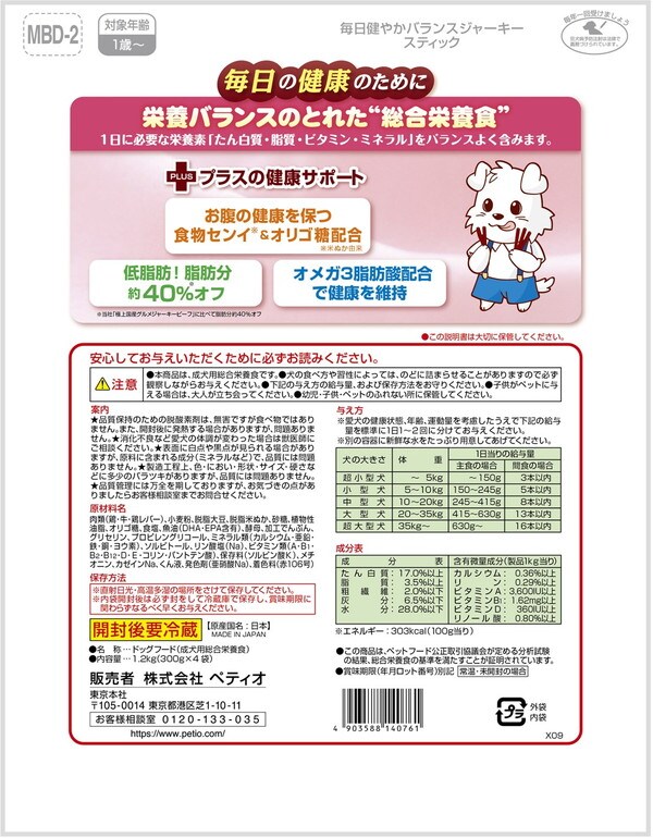 与える目安量がわかりやすい1ヶ月使い切りパック。1日に必要な栄養素「たん白質・脂質・ビタミン・ミネラル」をバランスよく含み、食物センイとオリゴ糖を配合した総合栄養食です。脂肪分を約40%オフ(当社比)してワンちゃんの健康をサポート。多頭飼いのおウチにもオススメです。スティックタイプ。
