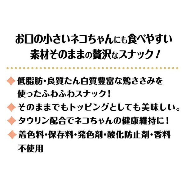 鶏ササミ、食塩、ソルビトール、グリセリン、リン酸塩(Na)、タウリン、調味料(アミノ酸)