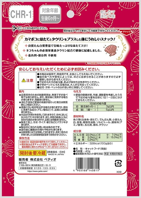 良質たん白質豊富で旨味たっぷりのホタテ入り!ネコちゃんの必須栄養素タウリン配合で健康に配慮しました。保存料不使用