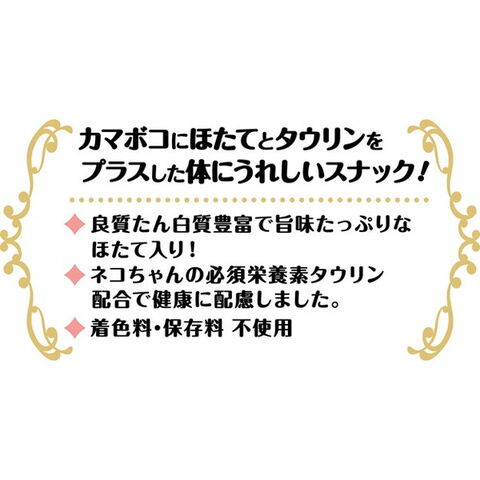 良質たん白質豊富で旨味たっぷりのホタテ入り!ネコちゃんの必須栄養素タウリン配合で健康に配慮しました。保存料不使用