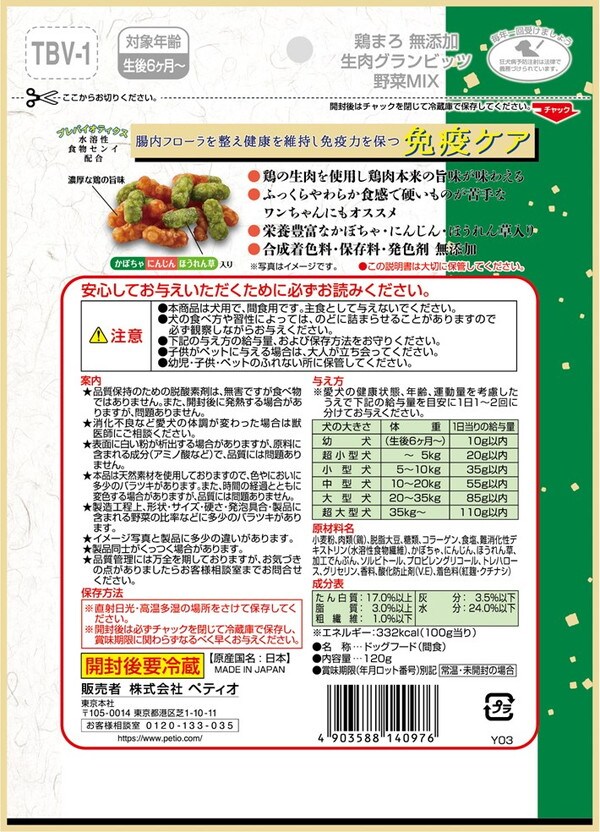 小麦粉、肉類(鶏)、脱脂大豆、糖類、コラーゲン、食塩、難消化性デキストリン(水溶性食物繊維)、かぼちゃ、にんじん、ほうれん草、加工でんぷん、ソルビトール、プロピレングリコール、トレハロース、グリセリン、香料、酸化防止剤(V. E)、着色料(紅麹・クチナシ)