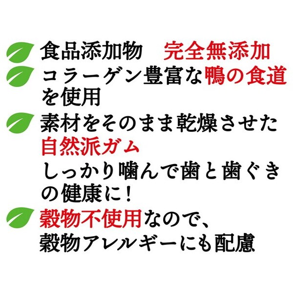 コラーゲン豊富な鴨の素材をそのまま乾燥させた自然派ガムです。噛むことで歯と歯ぐきの健康維持に。美味しさ長持ちのロングタイプ(※「ニューグリーン 完全無添加 ダックファイバースティック カットタイプ」に比べて(メーカー調べ)) 穀物不使用なので、穀物アレルギーにも配慮。食品添加物完全無添加。農林水産省認定 鳥加熱処理工場製造。